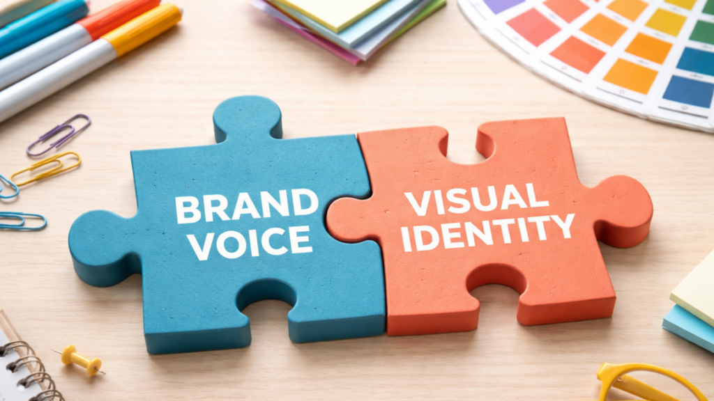 This is where many brands miss a critical distinction. Strong branding is not just visual identity, and it is not just messaging. It is the relationship between the two. To build a brand that feels clear, consistent, and memorable, both brand voice and visual identity need to work together as one unified system.